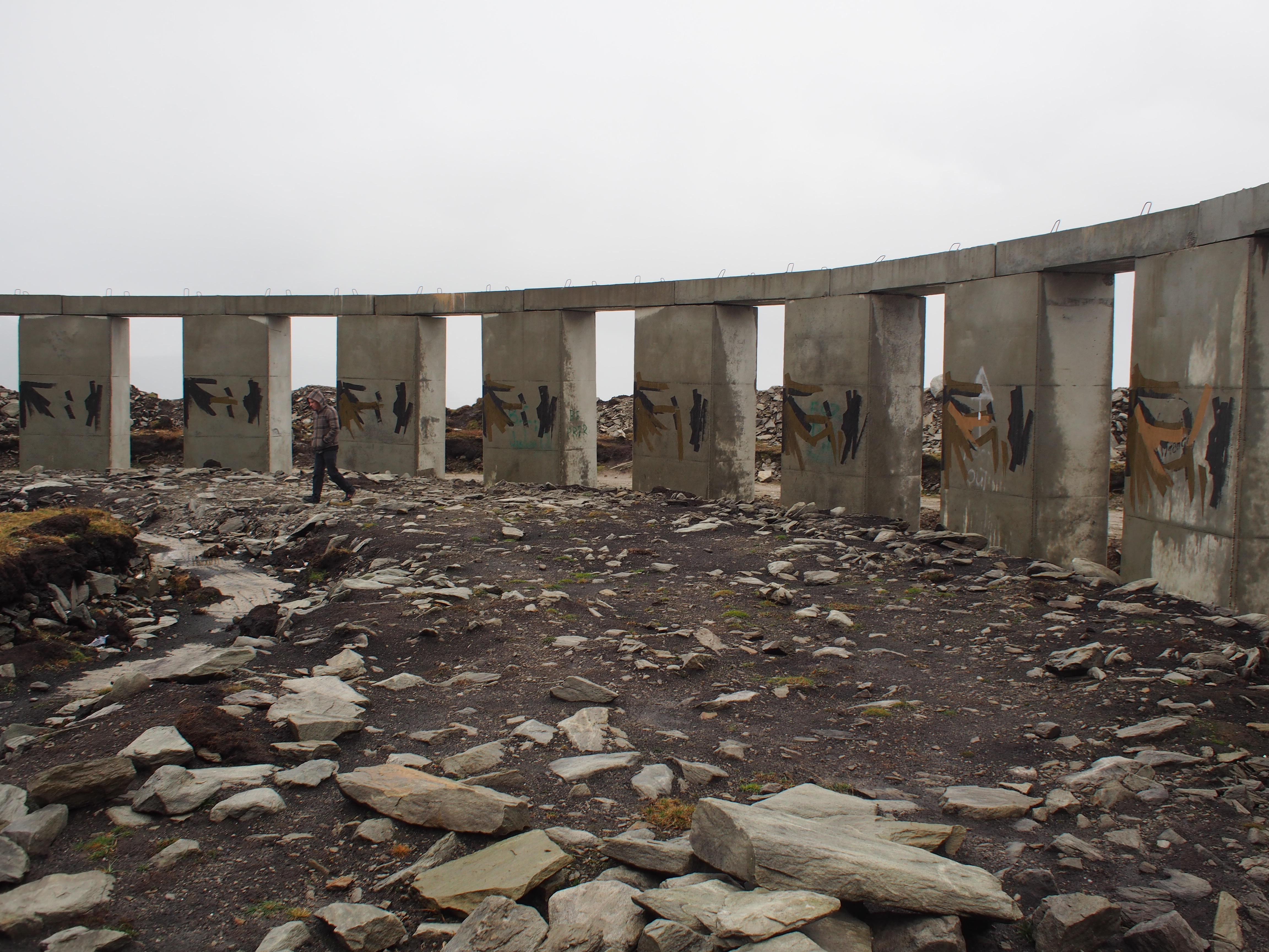 I returned again recently to Achill – Henge to see if my feelings about the place had changed I was also strangely attracted to the henge and have spent hours wondering about the energy in the place. I entered the circle of stones again and found familiar but strange feelings, a sense of another world the place was different though somebody has painted faces on each pillar starting with some vague outlines and finishing with an anime like face with a green eye and an odd hue and dark expression. I wondered how my dog would take it, he was freaked out, his bark reverberating around the stone circle made his head wobble from side to side as he tried to figure out what was going on.