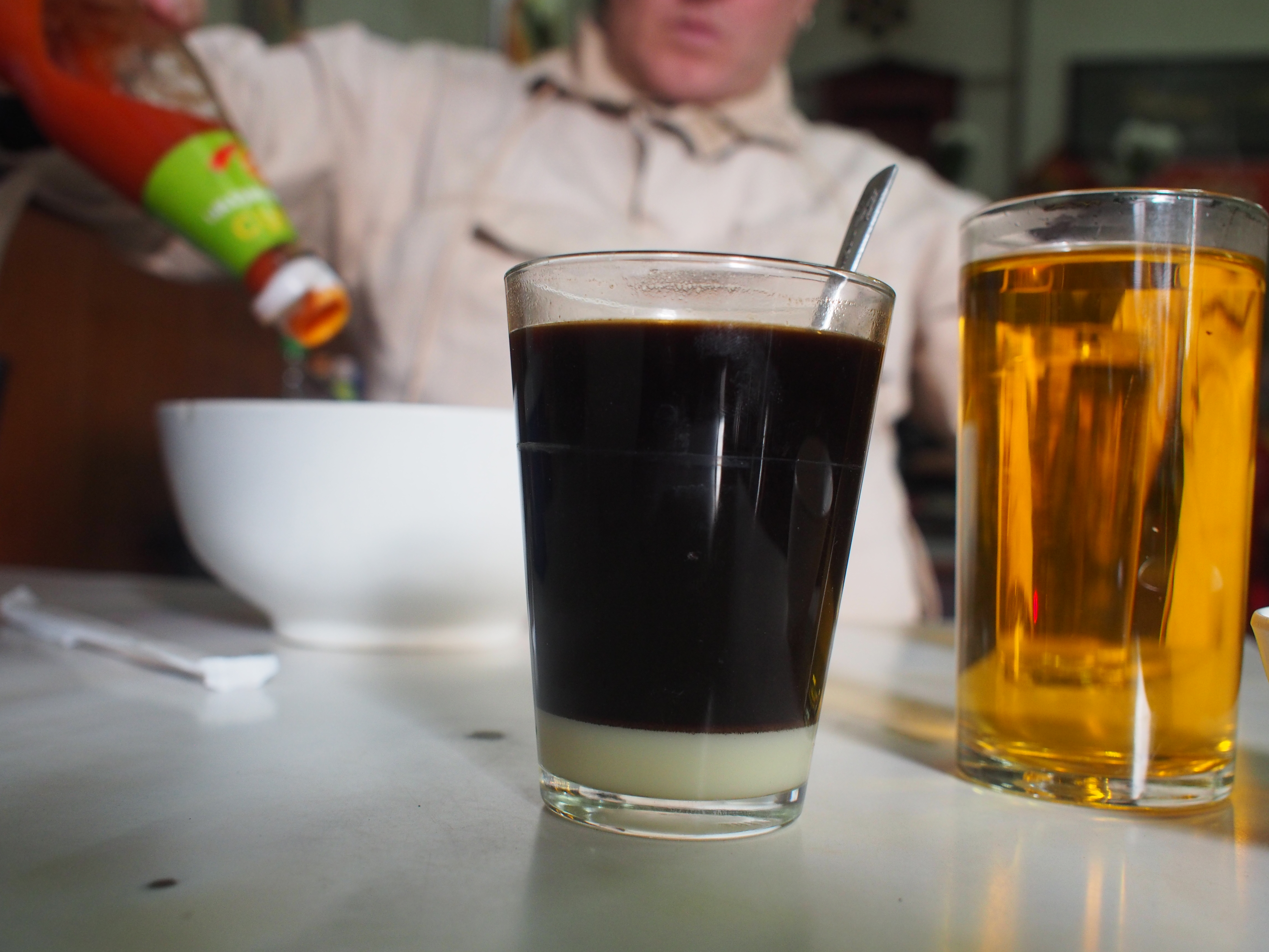 The coffee is delicious, a good dollop of sweetened condensed milk is added to a glass and then through a sieve or sock the coffee is poured over it and you get what is in the picture.