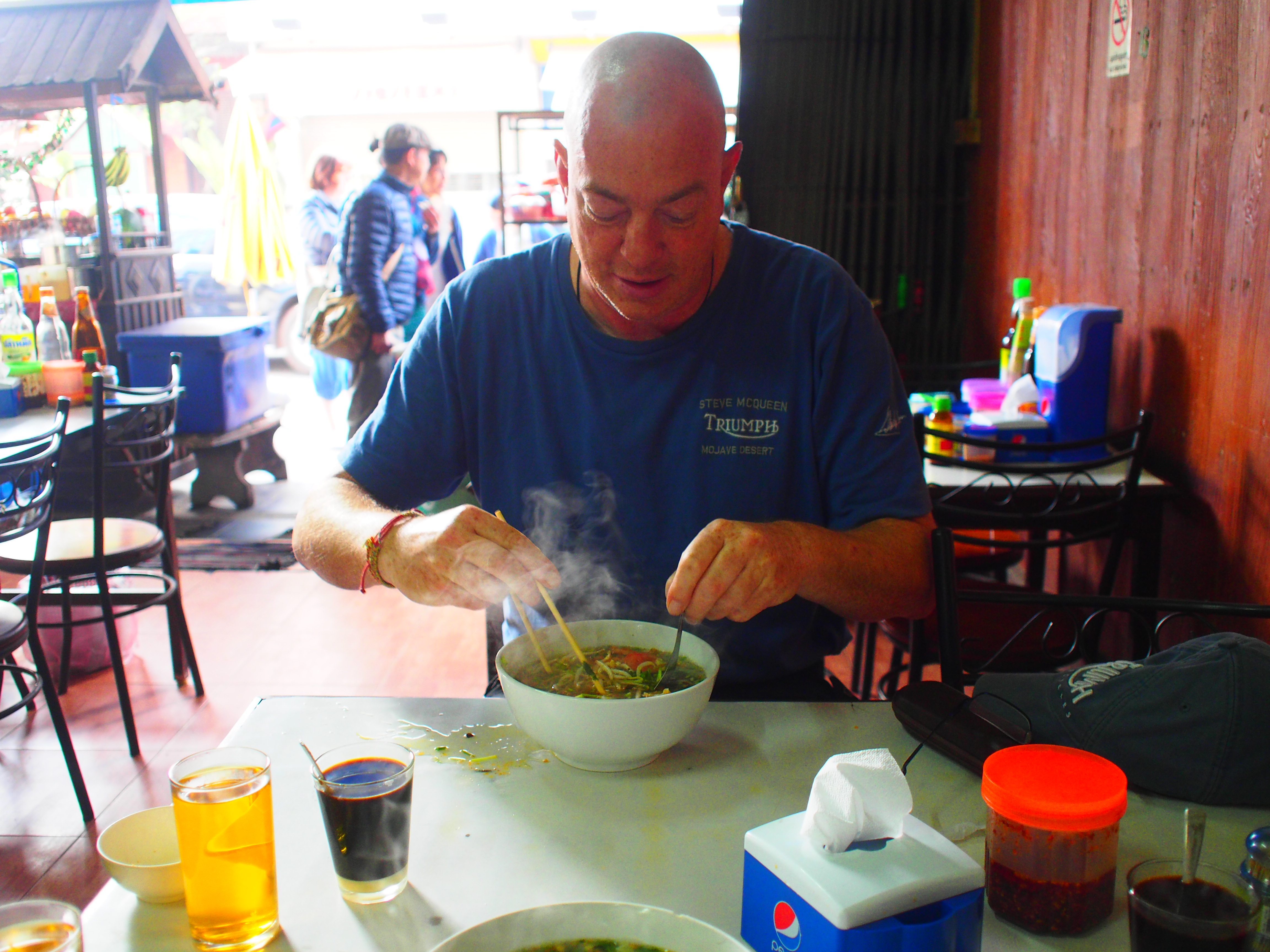 “Feu” or noodle soup with crispy pork, or just about anything you want added is what I consider to be the king of breakfasts and with a glass of sweetened Lao coffee and your ready for any adventure. I have added a few pic’s from my favourite noodle shop in Vientiane, what I really like about “feu” apart from the taste is that it is always prepared freshly – noodles at the ready, broth added and then the meat, bean sprouts, Coriander, spring onions etc, handed to you and then you add the nam pla , prik, soy, sugar, vinegar, dried chilli’s or whatever is at hand.